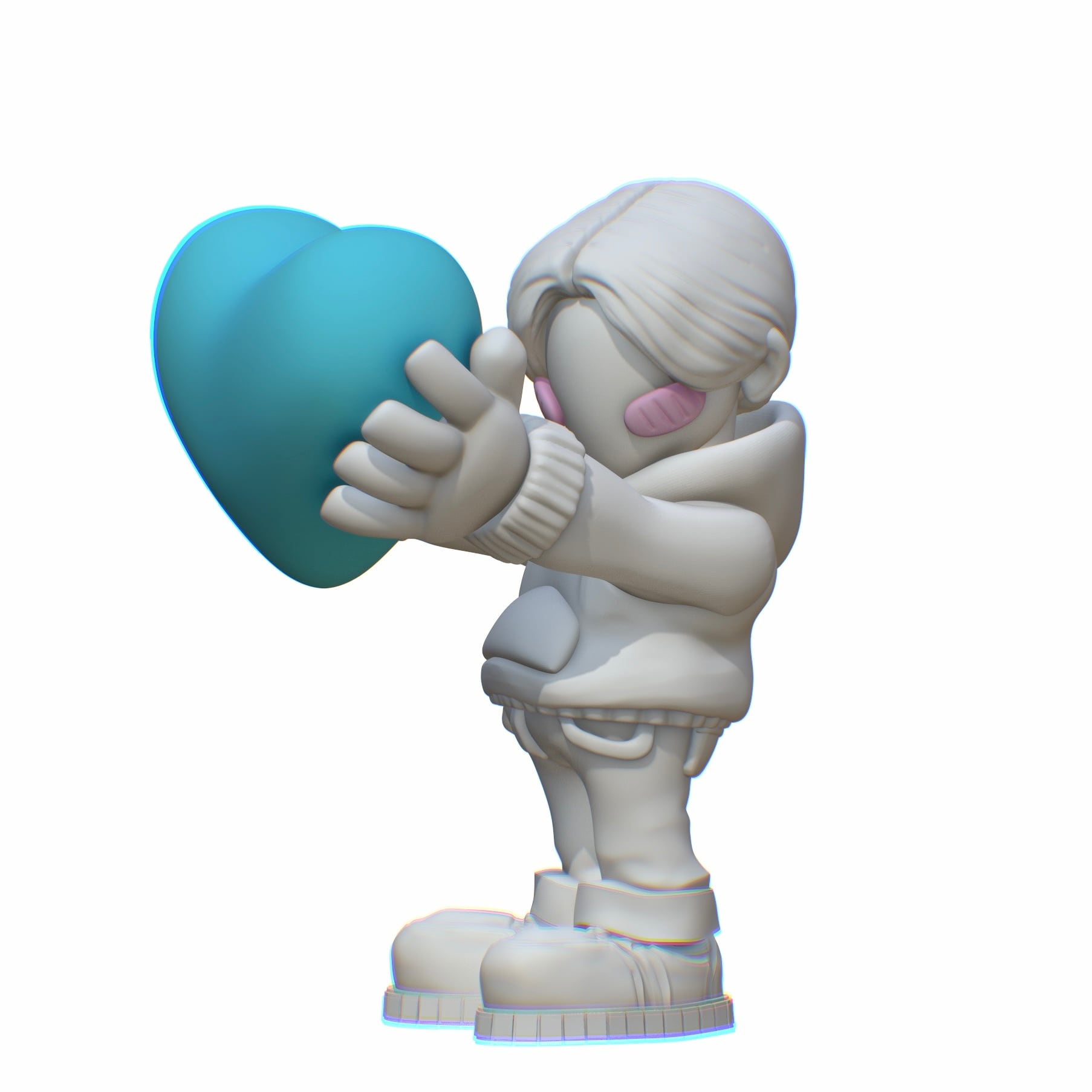 青いハートを掲げ、照れているところがミソです。